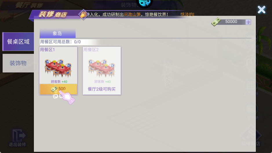 5、在装修界面选择心仪餐桌款式,消耗相应货币完成购买。
