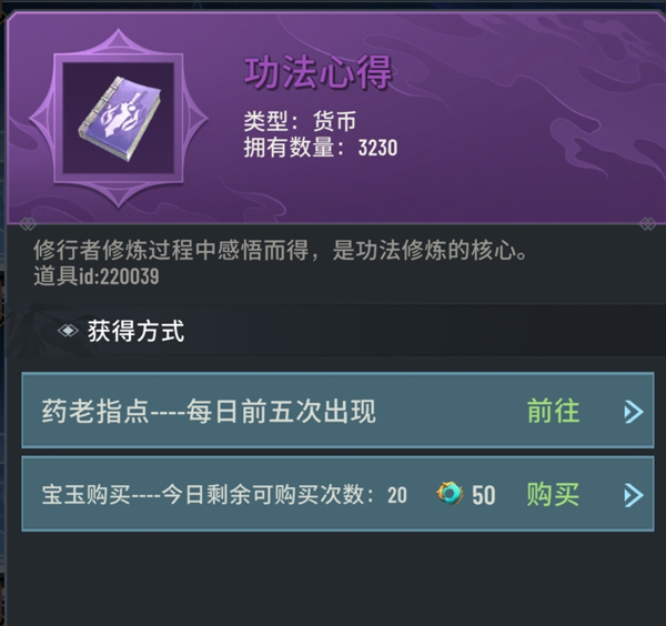 功法心得:用于提升功法等级,可通过每日“药老指点”任务及宝玉商城购买获得。