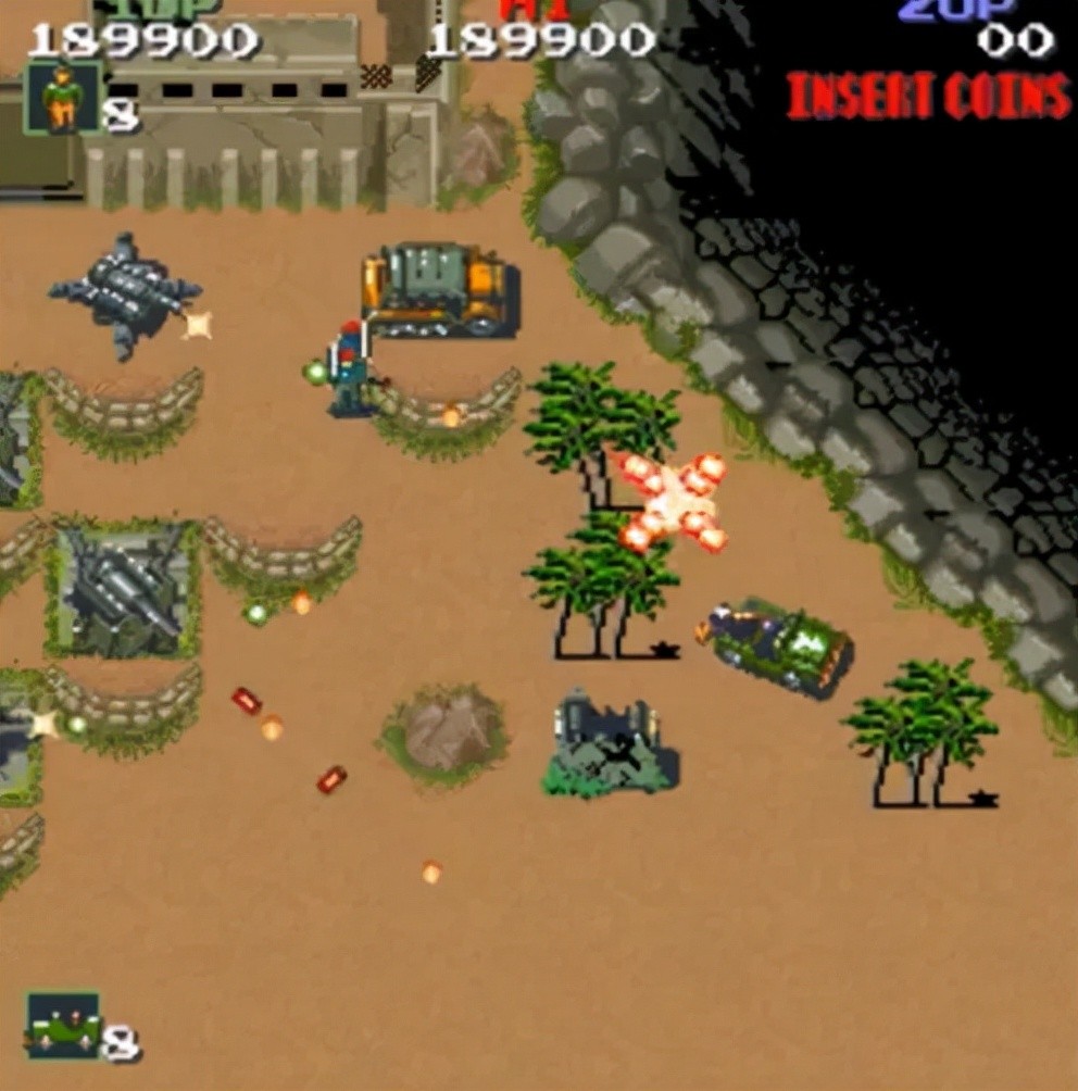 1986年推出的街机版,基本玩法操作与FC版基本一致,但是不分关卡,玩家要一口气打到底,整个内容包括了FC版除第三关海港之外剩下5关,最终只有一个BOSS,那就是FC版最后那个大炮台,大炮台摧毁之后的大坦克以及之前关卡的BOSS都没有。尽管如此游戏的难度仍然远高过FC版,各种杂兵的数量和火力强度超高,新手经常被突然出现的敌人和炮台秒杀,另外像坦克等大型敌人被击中后也不是直接爆炸消失,而是有一个延迟动画,在爆炸时碰到敌人也会死命。