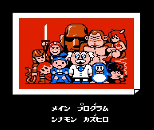 KONAMI博士找来了KONAMI先生,也就是右边这一位类似超人的内衣外穿这位,其实KONAMI是想把KONAMI先生做成类似马里奥这样的KONAMI标志性游戏角色的,作为公司的招牌游戏人物或者说吉祥物这样的,但是很可惜,在之后KONAMI先生的知名度并不高,