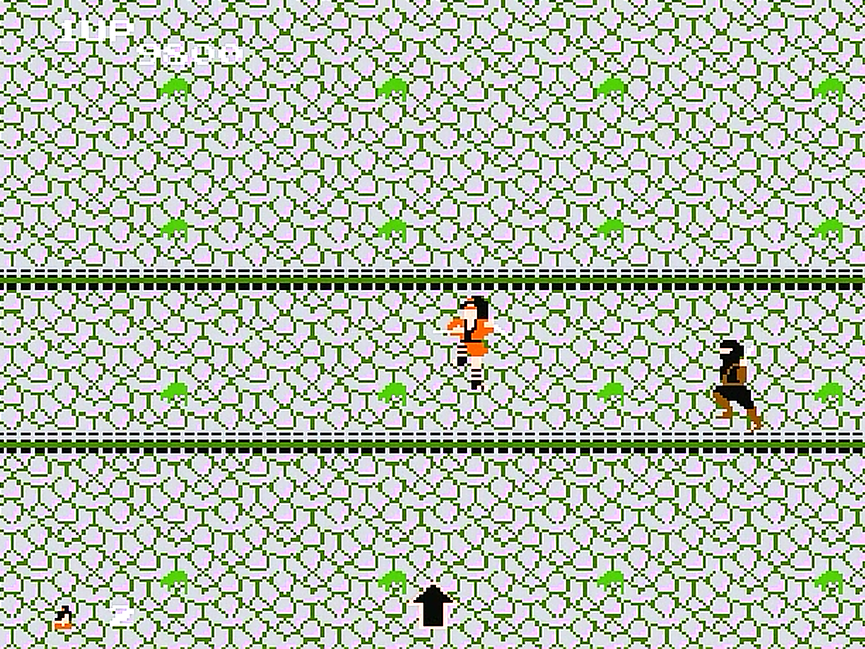 蓝色忍者只会丢普通飞镖和刀砍,而红色忍者会丢烟玉,攻击是飞镖的两倍,只有主角是黄色衣服才能抵挡一次,绿衣的话一下就挂。还有一种黑衣忍者,只在那个一直向上跳跃的场景会出现,挂掉后掉落卷轴,吃到后主角会念咒,出现在屏幕的小兵都会挂掉,看似华丽,实际没有用,也可以理解成是一个变相加分道具。并且念咒的背景音比较刺耳。