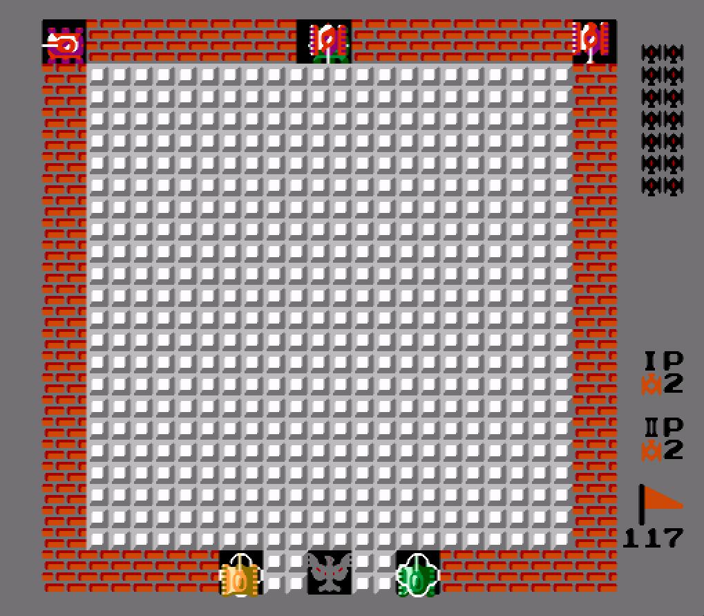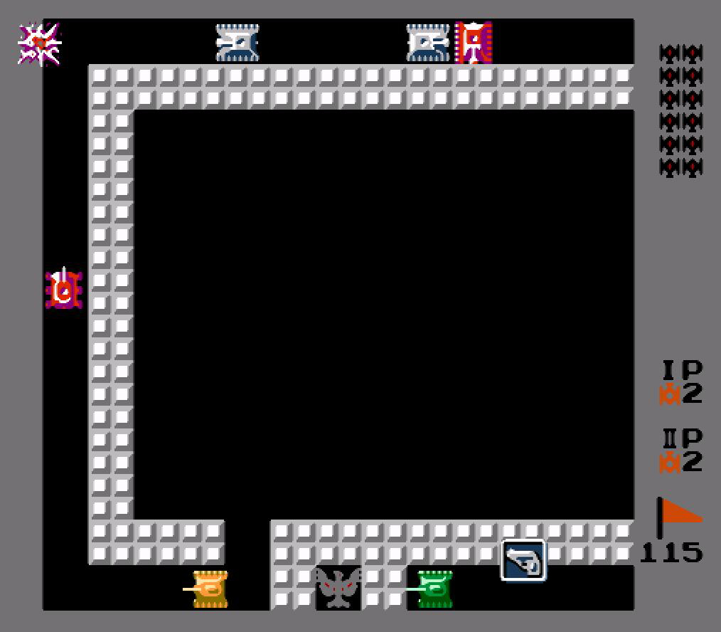 其实,玩家们用得最多的场景就是将2P玩家给困住(如下图),只要敌人打不到这方基地就万无一失了。而2P只能默默注视着1P将敌方消灭干净了,将所有的道具收入囊中,而自己什么办法都没有。