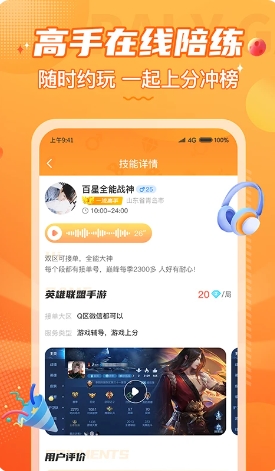 开放双向服务生态:普通玩家可快速约玩;高段位玩家亦可申请成为认证陪玩师,完成手机号实名验证后即可接单,轻松将游戏技术转化为稳定收益。