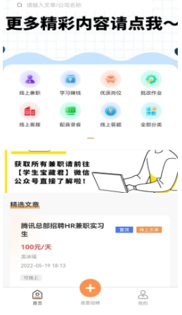 任务类型全面覆盖:线上问卷、内容创作、APP试玩、校园地推、资料整理、外语翻译……总有一款契合你的兴趣与技能;支持按“专业标签”精准匹配,计算机系接开发测试,艺术生接绘图设计,文科生接文案撰写,人岗高度适配。