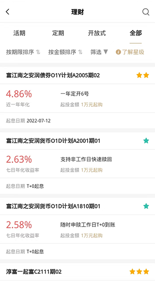 2、进入理财页面后,点击【全部】,浏览所有在售理财产品;