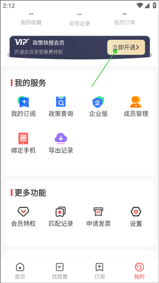打开政策快报app,进入“我的”页面,点击下方绿色区域即可完成购买: