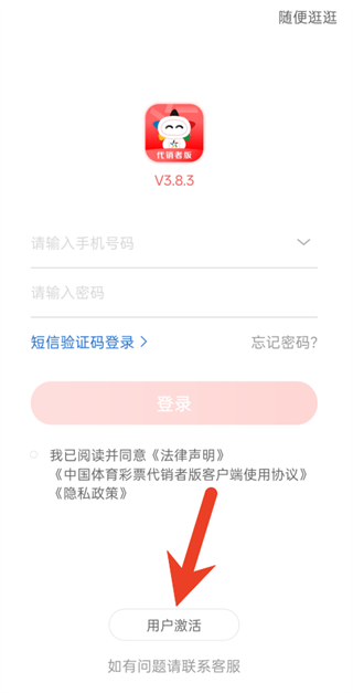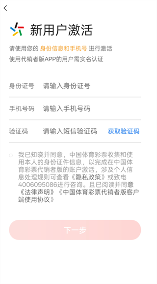- 若您为中国体育彩票官方授权的代销者,且身份证与手机号已在官方系统登记并由本人使用,请打开App后点击底部“用户激活”入口,进入账号激活页面。