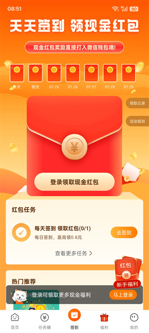 4、别忘了每日签到,连续打卡还能领取额外现金红包,积少成多。