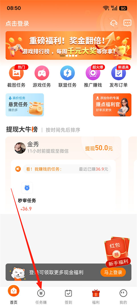1、打开每天赚点App,点击首页【任务赚】入口,进入任务大厅。
