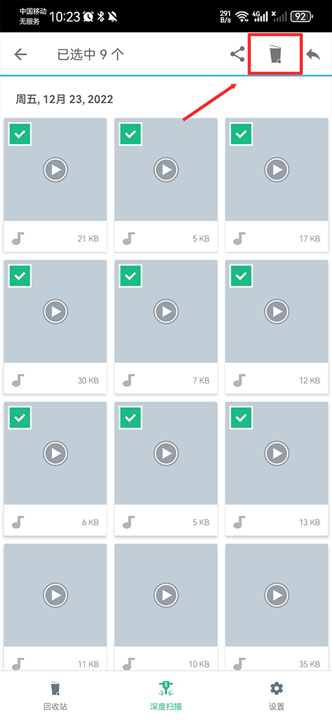 2. 勾选所有需删除的文件,点击右上角垃圾桶图标执行批量删除。