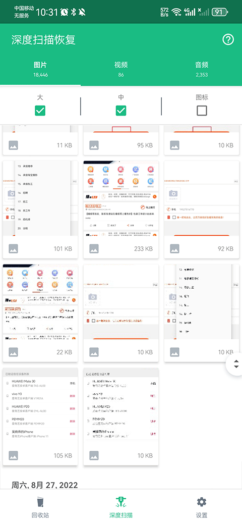 1. 打开应用,进入“深度扫描”界面,系统将自动检索历史删除的图片、视频及音频文件。