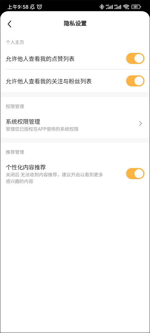 在隐私设置页面,你可以灵活控制他人是否能查看你的点赞列表、关注与粉丝列表,有效保护社交隐私。此外,还可选择是否允许 APP 推送个性化内容推荐。关闭此功能后,系统将不再根据你的兴趣推送相关内容。建议保持开启状态,以便持续获取契合口味的优质内容。