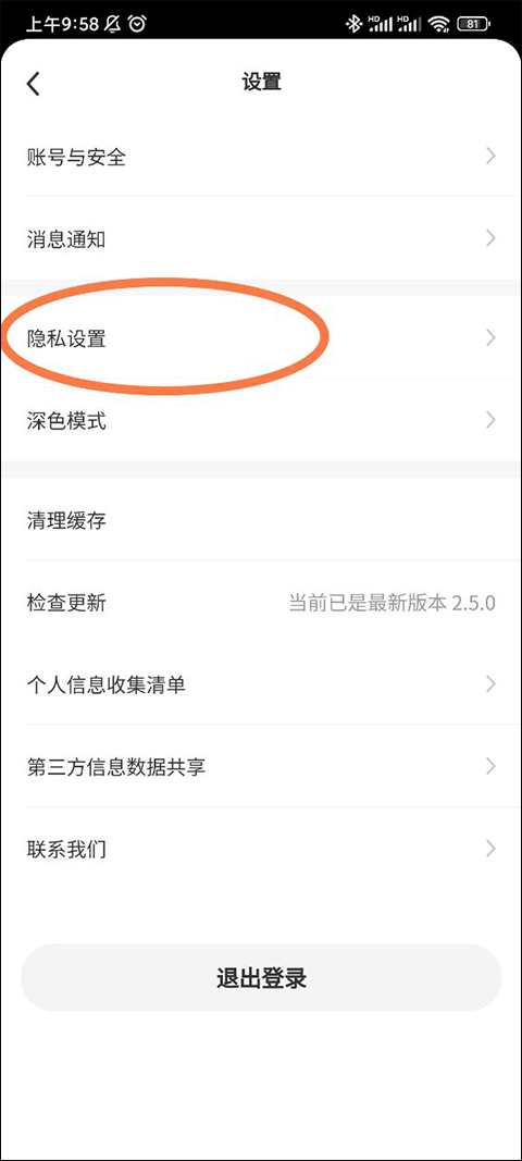在设置界面中,你可以开启深色模式以保护夜间用眼,也可管理账号安全等选项。要调整隐私设置,请点击“隐私设置”进入专属配置页。