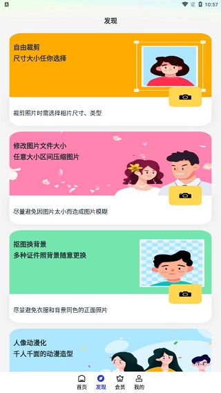 除基础拍摄外,软件还集成多项实用编辑功能,包括图片裁剪、文件大小调整、智能抠图换背景、人像风格化等,满足个性化与合规性双重需求。