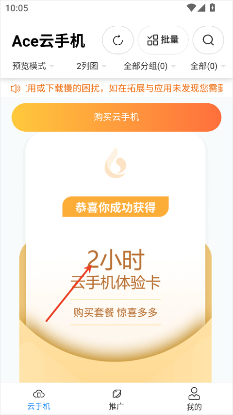 1、下载并打开ace云手机app,完成注册后即可免费领取2小时云手机体验卡;