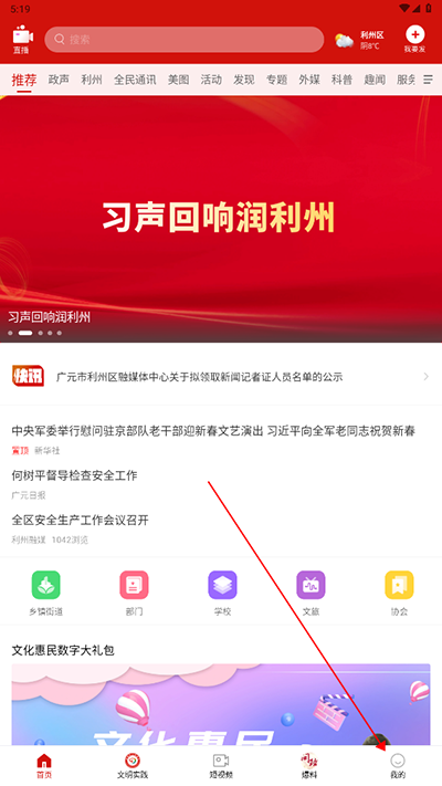 1. 打开利州融媒App首页,点击底部导航栏中的“个人中心”;