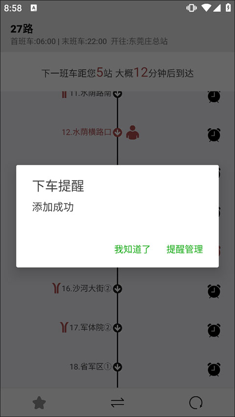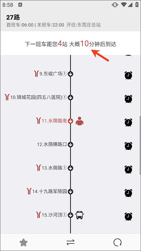 3、在目标站点旁点击闹钟图标,即可开启到站提醒功能,确保不错过下车时机。