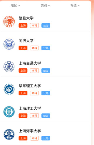 2、系统将展示全国绝大多数高校列表,支持按地区、院校类型(如综合类、理工类、师范类等)进行高效筛选,快速定位目标学校。