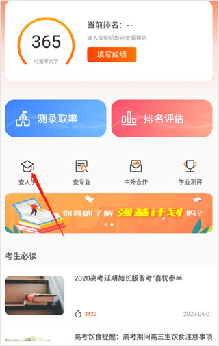 1、安装并打开熊猫志愿填报app,首页功能一目了然。若想了解高校详情,点击“查大学”入口即可开启院校探索之旅。