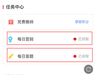在“我的”页面中,可便捷完成每日签到与每日答题任务,持续积累学习积分。