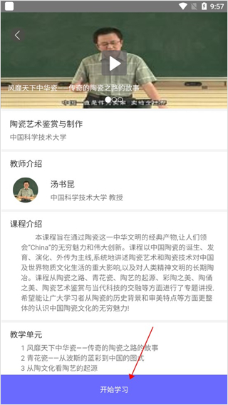 4. 在课程详情页,点击底部“开始学习”按钮进入学习界面。