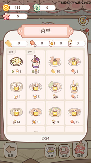 3. 点击底部菜单,使用指定食材(如煎蛋、鸡腿、调料、小麦)解锁或升级菜品,丰富菜单以满足更多妖怪客人的口味偏好。