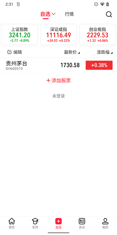 3、自选:满足用户对大盘行情数据、个股行情数据的查看,且有精选指标注入。其中行情中的自选股功能与选股功能的打通,不让优质的股票从指尖溜走。