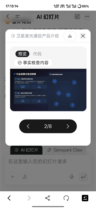 5. 以卫星激光通信产品为例,上传资料后稍等片刻,Genspark AI即可自动生成结构完整、图文并茂的PPT,点击即可预览。