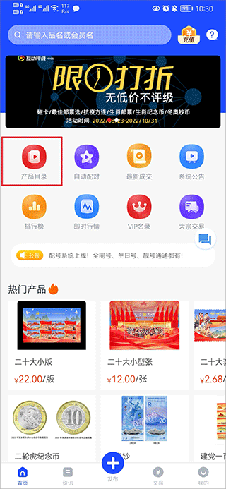 1. 打开邮币卡互动网App,进入首页后点击【产品目录】。
