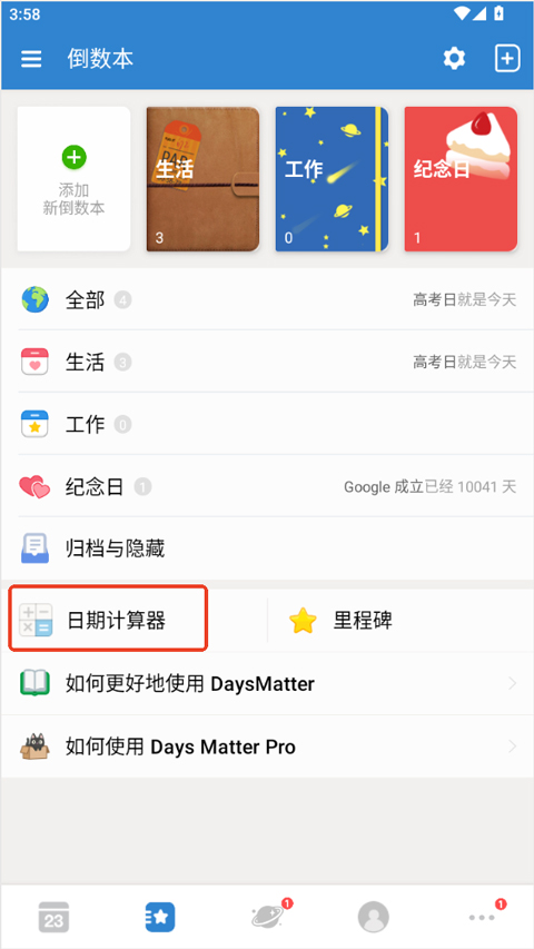 1、进入首页,点击右上角添加新日子,例如你的生日或者高考时间,并设置到相应时间