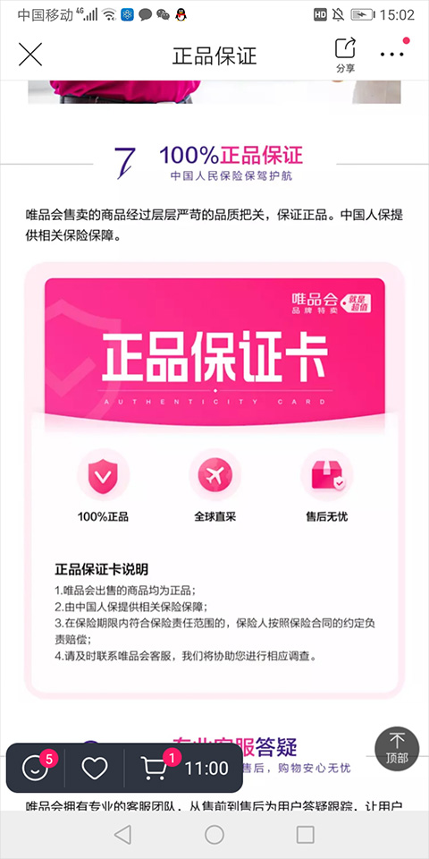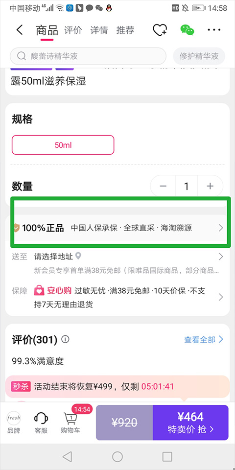 在商品详情页,用户可清晰看到“100%正品 中国人保承保”标识。点击该提示即可跳转至正品保障页面,内含详细的防伪溯源操作指南,帮助用户自主查验商品来源。