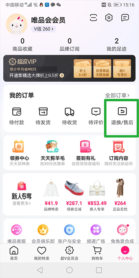 用户可在唯品会App【个人中心】中点击【退换/售后】进入服务页面: