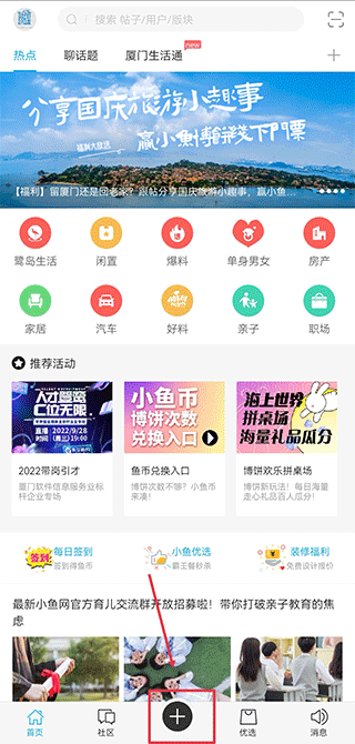1、打开小鱼网app,点击底部导航栏中间的“+”号按钮。