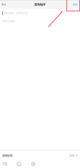 3、编辑标题与正文内容,添加图片或标签后,点击右上角“发布”按钮即可成功发帖。