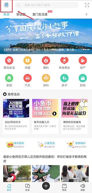 1、打开小鱼网app,在首页点击左上角头像或图标进入个人中心。