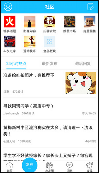 3、进入“社区”板块,可浏览招聘求职、房屋租售、车友之家、运动快乐等分类内容,并实时查看最新本地新闻;