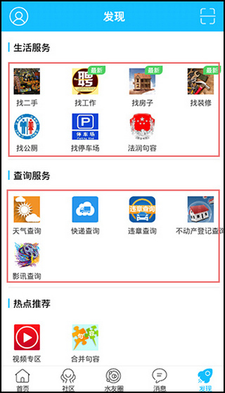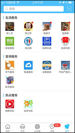 5、在“发现”页面,提供找工作、找装修、天气查询、快递追踪、违章查询等一站式便民服务,满足多样化生活需求。