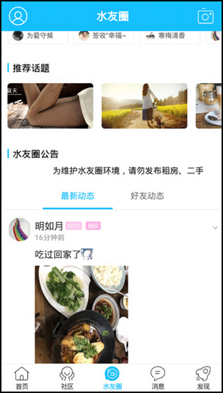 4、“水友圈”聚焦社交互动,包含交友、邂逅、话题讨论及附近动态,随时查看其他用户发布的精彩内容;