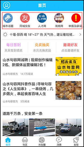 1、下载安装山水句容网app后,打开应用即可看到首页、社区、水友圈、消息、发现五大主板块;