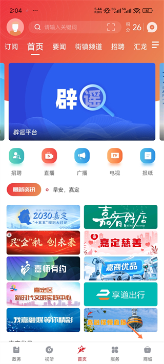 1. 打开上海嘉定官方版App,点击底部导航栏中的“商城”入口。